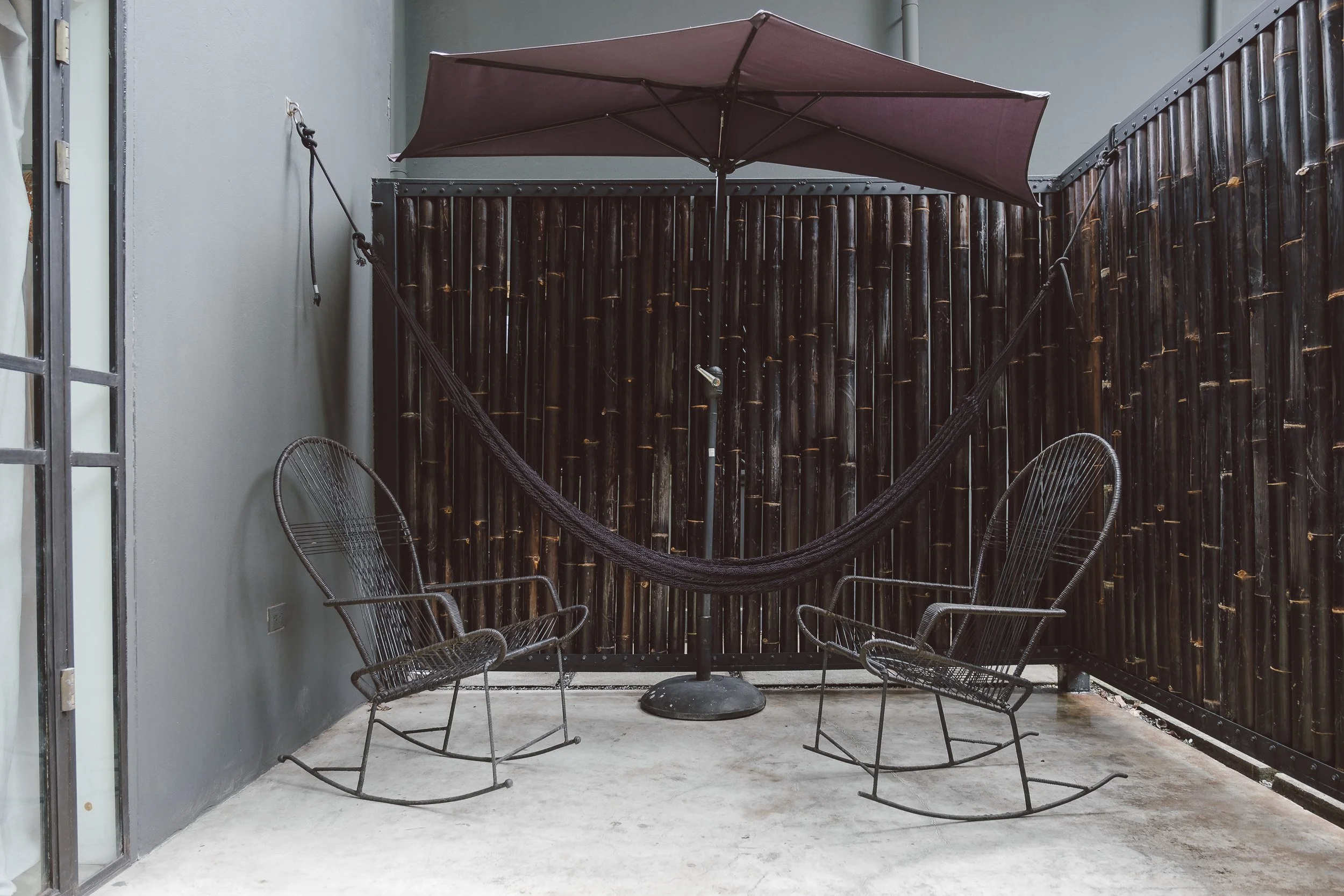 Located on the ground floor, it opens onto a private terrace with a hammock, seating for two, and a sun umbrella for when the day heats up. Mornings stay shaded and slow, while afternoons bring the sun across the space.